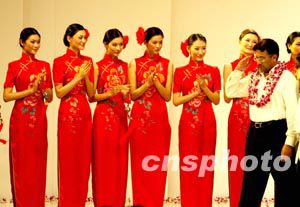 霓虹閃爍,音樂悠揚。大紅燈籠,大紅中國結(jié),大紅旗袍,象征著亞洲的勃勃生機……嘉賓們握著模特們拋獻的中國繡球、胸掛串串紫色蝴蝶蘭,意猶未盡……。