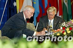 澳大利亞前總理霍克(右)十一月三日主持博鰲亞洲論壇2003年會主議題為“亞洲尋求共贏-合作促進發(fā)展”的演講會。中新社記者:毛建軍