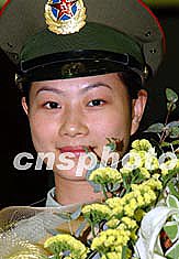 圖為駐港部隊(duì)女兵向楊利偉獻(xiàn)花。