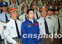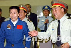 楊利偉與中國(guó)首次載人航天飛行代表團(tuán)受到駐港部隊(duì)司令員王繼堂、政委王玉發(fā)和官兵們的熱烈歡迎。