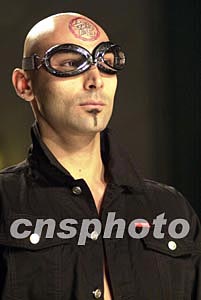 成龍系列男裝(二00四年春夏季男裝)中國揭幕式暨時裝展十一月五日晚在廣州舉行,外籍男模激情演繹“龍旋風”時裝。作者:陳文