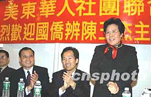 今天早晨,陳玉杰一行七人首先到紐約華埠拜訪美東華人社團聯(lián)合總會,雖然只是臨時會所,但陳玉杰為能親臨僑團感到高興。由于“非典”原因,今年一月出任國僑辦主任的陳玉杰上任十一個月來一直未能到海外與僑胞見面,昨天下午抵達紐約的陳玉杰每次見到僑胞都為此致歉。如今在海外僑團的會所里,面對親切的僑胞,陳玉杰說自己表個態(tài):將竭盡全力為僑服務。
