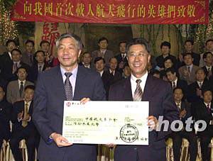澳門中國企業(yè)協(xié)會會長吳亦新六日代表該協(xié)會向中國航天基金會捐款六十三萬港圓,中國載人航天飛行代表團(tuán)團(tuán)長胡世祥代為接收。中新社記者:李剛