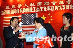 美東時間十一月六日晚,正在紐約訪問的中國國務院僑務辦公室主任陳玉杰出席了美東各界華僑華人為她率領的國僑辦代表團舉行的聯(lián)合歡迎宴會席間,國僑辦主任陳玉杰向紐約僑胞贈神舟五號飛船模型。中新社記者:陳建