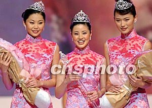 “2003中華小姐環(huán)球大賽”總決賽11月8日晚在香港會(huì)展中心舉行,圖為來(lái)自上海的佳麗江欣榮獲大賽冠軍、吉林佳麗胡古玥(左)獲亞軍、黑龍江佳麗谷雨(右)獲季軍。中新社記者:錢興強(qiáng)