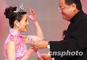 香港鳳凰衛(wèi)視董事局主席劉長(zhǎng)樂,11月8日晚在香港會(huì)展中心舉行的“2003中華小姐環(huán)球大賽”總決賽上,為獲得中華小姐稱號(hào)的冠軍江欣榮頒獎(jiǎng)。中新社記者:錢興強(qiáng)