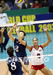 2003年11月9日,第九屆女排世界杯賽在日本舉行。多米尼加隊(duì)9號隊(duì)員阿里亞斯被查出服用興奮劑。圖為11月3日阿里亞斯(右)在同中國隊(duì)的比賽時準(zhǔn)備攔網(wǎng)。中體在線/供圖