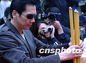 香港藝員劉青云、周聰在拜神儀式上。 中新社記者:錢(qián)興強(qiáng)