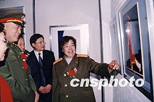 一百一十周年邵華舞臺(tái)藝術(shù)攝影作品展,十一日在山東省城濟(jì)南東方藝術(shù)館舉行,毛澤東的兒媳婦邵華(右一)少將向來賓介紹作品。作者:郝帆