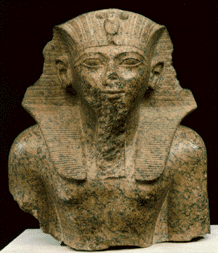 在這批珍品中最引人矚目的是具有千年以上歷史的古埃及新王國(guó)時(shí)期的圖特穆斯四世的花崗石半身像。這件原本保存于盧浮宮內(nèi)的古埃及文物,最大特色在于他頭頂上的那個(gè)蛇形頭冠。