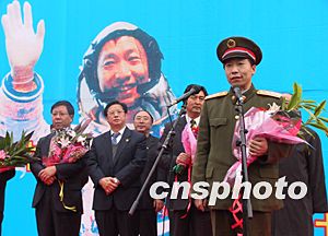 載人航天工程先進(jìn)事跡報告團(tuán)一行十三日抵達(dá)山城重慶,中國首位航天員楊利偉亦隨團(tuán)抵達(dá)。楊利偉說,重慶是他的第二故鄉(xiāng),今天他再次感受到了山城人的熱情。圖為楊利偉在重慶舉行的歡迎儀式上致辭。作者:鄒輝