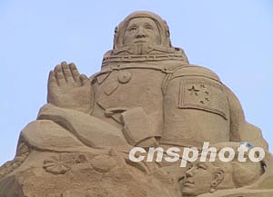 首屆?趪H沙雕賽十一月十五日在?谑形骱0洞蠛_呴_雕。來自中國、美國、西班牙等七個國家的數(shù)十名沙雕藝術(shù)家們參加本次比賽。圖為中國藝術(shù)家們雕刻的航天英雄楊利偉形象。中新社記者:王辛莉