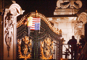 圖:英婦女抗議布什訪英竟攀爬白金漢宮大門(mén)