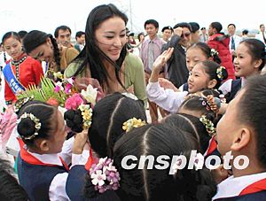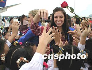 世界小姐參賽佳麗對(duì)前來歡迎的小朋友們十分親善。趙曉兵 攝