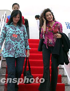 剛走下舷梯的世界小姐機(jī)構(gòu)主席朱莉婭·莫莉(左)與二00二年世界小姐阿金 (右)。關(guān)向東 攝
