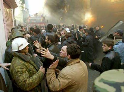 在成功控制格魯吉亞議會大廈后,格魯吉亞反對派又包圍了總統(tǒng)府。圖為格魯吉亞反對派與總統(tǒng)府外的警察發(fā)生沖突。(人民網(wǎng)圖)