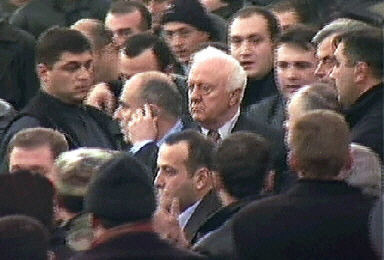 11月22日,格魯吉亞新一屆議會舉行第一次會議。當謝瓦爾德納澤在議會演講時,幾十名反對派人士沖入議會大廈,要求總統(tǒng)辭職。總統(tǒng)的支持者和反對派人士發(fā)生爭執(zhí),議會大廳一片混亂。謝瓦爾德納澤隨即在保鏢的保護下撤離,并表示拒絕辭職。