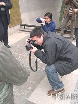 網(wǎng)絡(luò)媒體記者拍攝“歷史證人的銅版腳印”。作者:玉樹