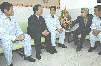今天是世界艾滋病日,國務(wù)院總理溫家寶,副總理吳儀,中央政治局委員、北京市委書記劉淇,衛(wèi)生部常務(wù)副部長、黨組書記高強,北京市代市長王岐山及其他部門的領(lǐng)導(dǎo)同志上午10:25來到北京地壇醫(yī)院"紅絲帶"之家,看望艾滋病病人,慰問醫(yī)務(wù)人員。