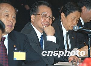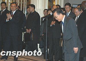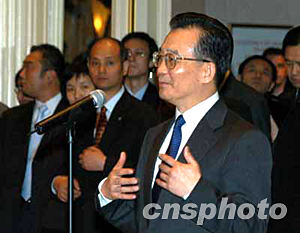 美東時間十二月七日下午,中國總理溫家寶甫抵紐約,即接見華僑華人、留學(xué)生和中資機構(gòu)代表。溫家寶說,大家冒著嚴寒風(fēng)雪,守候在這里好幾個小時,歡迎我和我的同事。大家的這份情意,不僅是給我和同事的,更是給祖國和人民的。他代表中國人民和中國政府,向旅居在美國的華僑、華人、留學(xué)生,向來自香港、澳門和臺灣的同胞,向領(lǐng)館的工作人員,致以親切的問候和良好的祝愿。隨后他向前方和左右三鞠躬,感謝僑胞們的熱情歡迎。作者:陳建