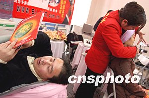 第九屆中國國際美發(fā)美容節(jié)之美發(fā)美容用品博覽會十二月十日在北京開幕,眾多男士也光臨展會親身體驗(yàn),如今美容已不再是女性的專利。中新社記者:張宇
