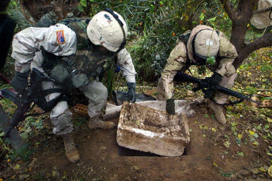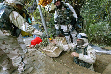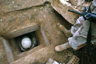 12月15日,在伊拉克提克里特附近,美軍第四步兵師士兵展示薩達(dá)姆被捕時(shí)藏身的地洞。