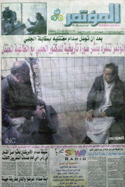 12月18日,伊拉克一份報(bào)紙刊登了伊拉克臨時(shí)管理委員會(huì)成員沙拉比(左)與被捕后薩達(dá)姆見面的照片。