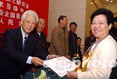 十二月二十二日,中國餐飲業(yè)最高獎項“伊尹獎”頒獎表彰大會在北京人民大會堂舉行,全國政協(xié)副主席周鐵農(nóng)(左)等向劉寶等二十八名獲獎者頒發(fā)了證書。中新社記者:武仲林