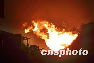 十二月二十三日二十二點(diǎn)十五分,位于重慶市開(kāi)縣高橋鎮(zhèn)的川東北氣礦發(fā)生天然氣井噴事故。圖為二十四日晚的井噴現(xiàn)場(chǎng)。作者:重晚