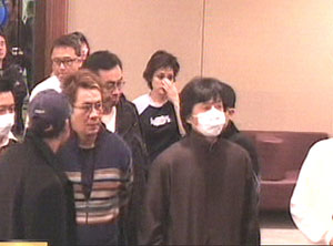 國際知名影星成龍(戴口罩者)與眾多梅艷芳圈中好友到醫(yī)院陪伴梅艷芳走過最后一程。(以上均為電視截圖)