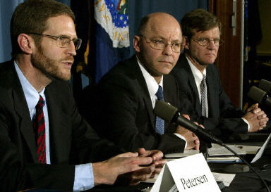 美國(guó)農(nóng)業(yè)部官員肯尼思·彼得森(左)29日在華盛頓的發(fā)布會(huì)上說(shuō),調(diào)查人員發(fā)現(xiàn)有問(wèn)題的牛肉已經(jīng)流入華盛頓州、俄勒岡州、加利福尼亞州、內(nèi)華達(dá)州、阿拉斯加州、夏威夷州、愛達(dá)荷州、蒙大拿州和關(guān)島的食品零售市場(chǎng)。美國(guó)食品和藥物管理局說(shuō),有關(guān)部門已經(jīng)下令在這些地區(qū)范圍內(nèi)回收總計(jì)4.5噸的牛肉。