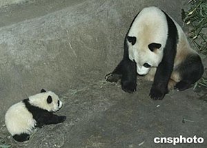 2004年新年鐘聲敲響前的2003年12月31日晚,出生整整一百三十天的北京動物園大熊貓“甜甜”在媽媽“妞妞”期待的目光和輕聲的召喚聲中,搖搖晃晃一步一步向前走。“甜甜”2003年8月24日在北京動物園出生,目前的體重已經(jīng)從出生時的150克增長到8,060克,預計在半周歲后斷奶離開媽媽獨立生活。中新社記者:任晨鳴
