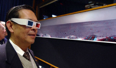 1月5日,在美國(guó)加利福尼亞州帕薩迪納的宇航局噴氣推進(jìn)實(shí)驗(yàn)室,彼特博士配戴著立體眼鏡觀看“勇氣”號(hào)火星探測(cè)器搭載的照相機(jī)拍攝的三維圖像。