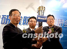 一月七日,三名微軟管理人員在北京交接火炬。微軟公司宣布,原微軟亞洲研究院院長張亞勤博士(中)將升任微軟公司全球副總裁,調(diào)回微軟總部,負責微軟移動通信及嵌入式系統(tǒng)在全球的開發(fā)業(yè)務。同時原微軟亞洲研究院副院長沈向洋博士(右)晉升院長,原微軟亞洲研究院副院長張宏江博士(左)被提升為新近成立的微軟亞洲工程院院長。中新社記者:張宇