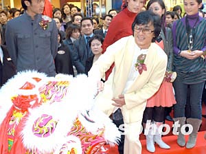 影星成龍1月9日在香港銅鑼灣出席英皇鐘表珠寶分店開幕禮,為助興的醒獅進行點睛儀式。中新社記者:鄧慶樂