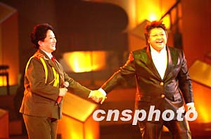 中國文聯(lián)十一日在北京舉辦《百花迎春--中國文學(xué)藝術(shù)界2004春節(jié)大聯(lián)歡》活動(dòng),著名歌手韓紅和母親雍西同臺(tái)演唱《翻身農(nóng)奴把歌唱》。中新社記者:王瑤