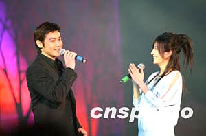 中國600多名藝術(shù)家十一日歡聚北京,在中國文聯(lián)舉辦的《百花迎春--中國文學(xué)藝術(shù)界2004春節(jié)大聯(lián)歡》上慶祝即將來臨的新春佳節(jié),演員趙薇、陸毅同臺(tái)演唱《好人好夢(mèng)》。中新社記者:王瑤