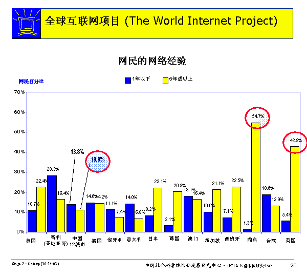 美國和瑞典有相當(dāng)高比例的網(wǎng)齡較長(zhǎng)網(wǎng)民(42.8%的美國網(wǎng)民和54.6%的瑞典網(wǎng)民有長(zhǎng)達(dá)5年或更長(zhǎng)網(wǎng)齡)