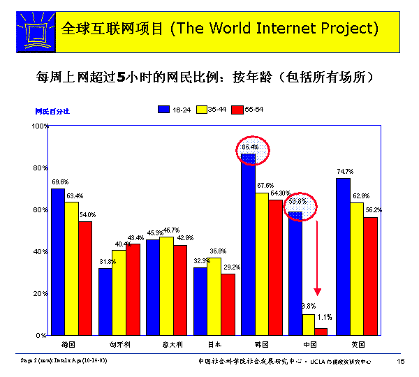 在德國(guó)、韓國(guó)、中國(guó)和美國(guó),年輕網(wǎng)民比年齡大的網(wǎng)民更可能每周上網(wǎng)5小時(shí)以上。