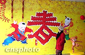 2004年1月14日,行人走過(guò)上海街頭一幅“喜娃報(bào)春”的年畫前。中國(guó)的傳統(tǒng)佳節(jié)——春節(jié)就要到來(lái),申城街頭隨處可見(jiàn)傳統(tǒng)的中國(guó)年畫。井韋 攝