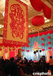 北京人民大會堂春節(jié)前夕舉行聯(lián)歡會,明亮的大廳內(nèi)高懸福字,慶祝中國農(nóng)歷猴年的到來。中新社記者:毛建軍