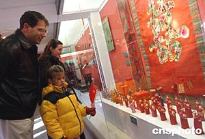 第三屆北京民俗文化節(jié)暨第六屆東岳文化廟會(huì)在北京古老的東岳廟舉行。其中民俗婚禮展廳展示的中國(guó)古代迎親儀仗隊(duì)伍的微縮景觀,吸引了一家在中國(guó)過(guò)春節(jié)的外國(guó)游客駐足觀看。中新社記者:張勤