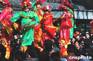 在北京大觀園廟會(huì)上,來(lái)自山西省大同地區(qū)民間特有的“撓擱”表演,吸引無(wú)數(shù)市民駐足觀看。“撓擱”是在一個(gè)壯漢身上綁起一根兩米高的鐵桿,頂端安有鐵座,化了妝的男童或女童綁坐在上面,被稱作“撓擱人”。中新社記者:王麗南