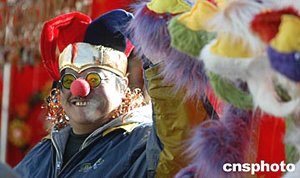 一名商販在剛剛開(kāi)幕的北京龍?zhí)稄R會(huì)上推銷常見(jiàn)于西方節(jié)日的妝飾用品,給傳統(tǒng)的中國(guó)廟會(huì)增添新鮮色彩。中新社記者:毛建軍