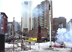 約華人社團(tuán)在華埠東百老匯且林是果廣場燃放爆竹,辭舊迎新。作者:趙海燕