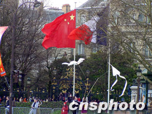 今天的香榭麗舍大街,兩旁編插的中法兩國巨幅國旗招展,中國紅燈籠和彩旗分外醒目,高音喇叭里播送著北京—巴黎大游行的中法文主題曲。法國人扶老攜幼,早早地在香榭麗舍大道兩旁排起了長陣,其中有的還從萬里之遙的法屬圭亞那專程乘飛機而來。