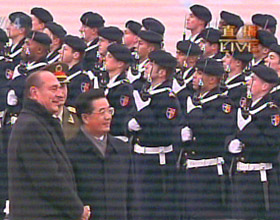 在希拉克陪同下,胡錦濤走上紅地毯,在法國軍樂隊(duì)演奏的中法兩國國歌聲中,檢閱了法國三軍儀仗隊(duì)。
