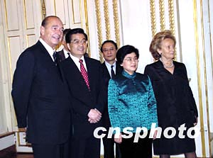 中國國家主席胡錦濤一月二十六日開始對(duì)法國進(jìn)行為期三天的國事訪問,法國總統(tǒng)希拉克當(dāng)日晚上在愛麗舍宮舉行國宴歡迎胡錦濤。圖為希拉克夫婦和胡錦濤伉儷共同會(huì)見來賓。作者:蔚中