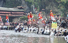 富有濃郁客家風(fēng)情的羅坊“走古事”,2月5日在“客家祖地”閩西連城縣羅坊鄉(xiāng)舉行,第四屆中國冠豸山客家民俗文化節(jié)由此拉開帷幕。羅坊“走古事”系由幾隊(duì)人馬各抬一架“古事”(上有一古裝打扮孩童),在陸上、水中爭先前行的民俗活動。作者:黃翔