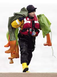 一名救援人員將找到的遇難者的防水服送上岸。